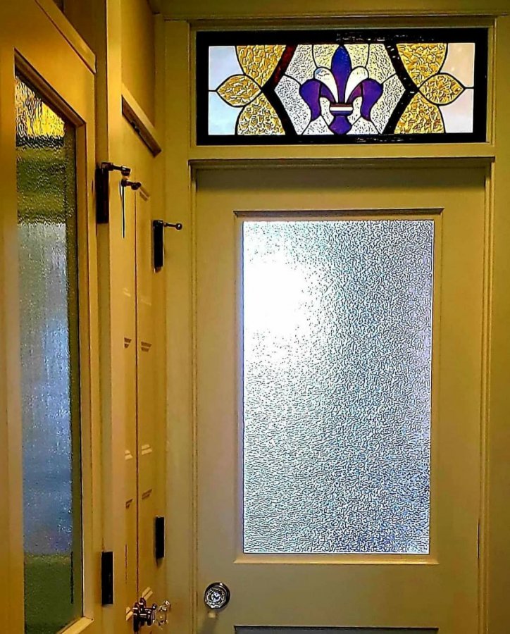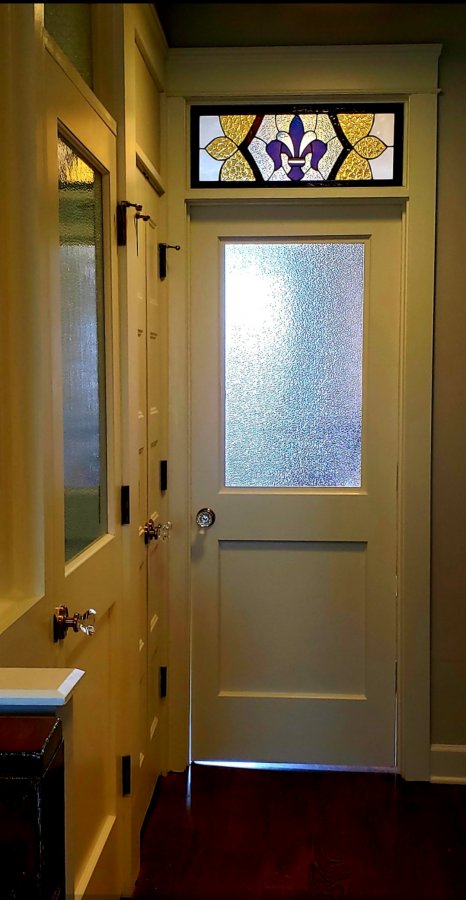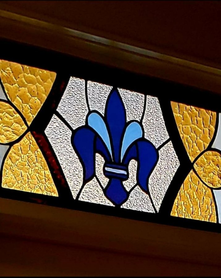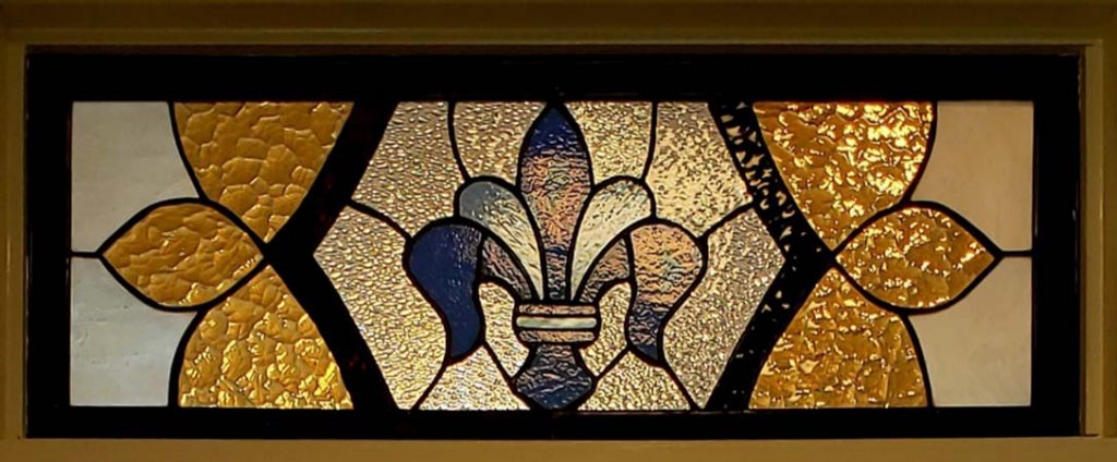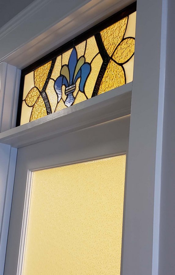 Pamela teamed up with interior designer, Rose DiNapoli, to design the stained glass windows for a 100 year old home in Washington, D.C. The actual motif for the Fleur de Lis came from the Basilica in Lourdes, France, where they visited while taking a break from restoring the stained glass windows at the Chateau de Gudanes.